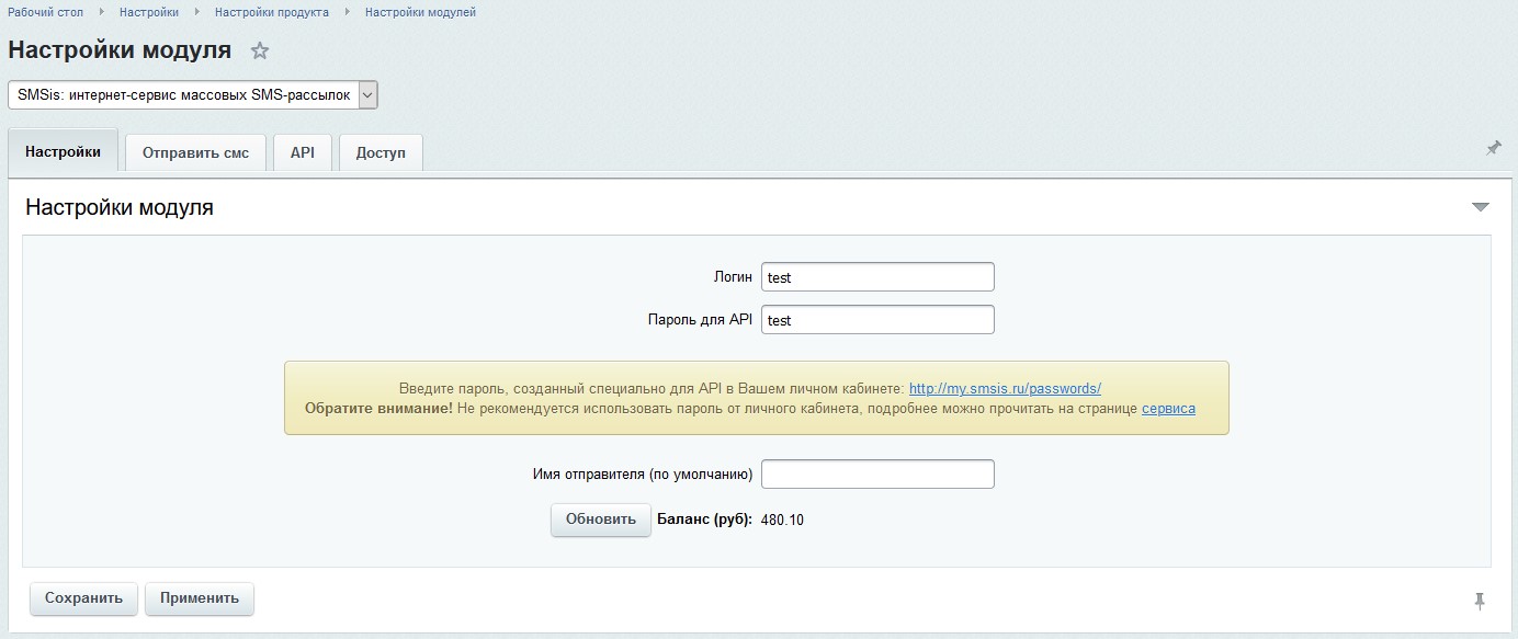 - Укажите Ваши логин и пароль от сервиса smsis.ru на вкладке "Настройки модуля" (Настройки -> Настройки продукта -> Настройки модулей -> SMSis: интернет-сервис массовых SMS-рассылок).