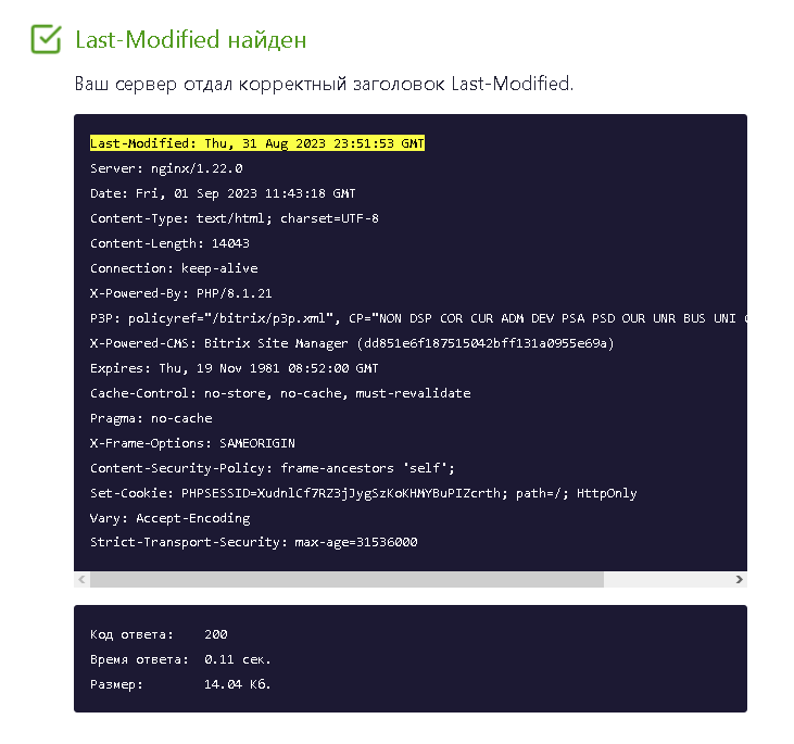 Модуль корректно работает со штатным функционалом вывода времени модификации страницы “Устанавливать в заголовках ответа время модификации страницы”. Устанавливается дата рассчитанная модулем.