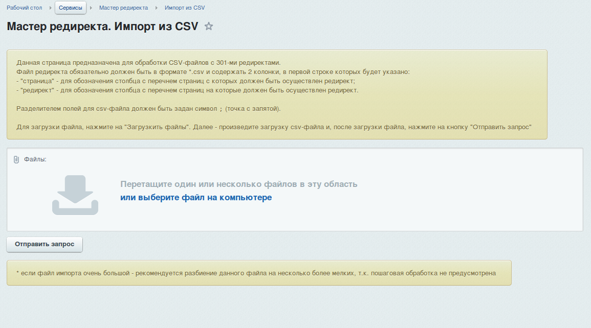 Для сохранения высокой скорости работы сайта избегайте загрузки очень больших CSV-файлов (например, на десятки тысяч строк). Разбейте объемные файлы на несколько частей и загружайте их по очереди.