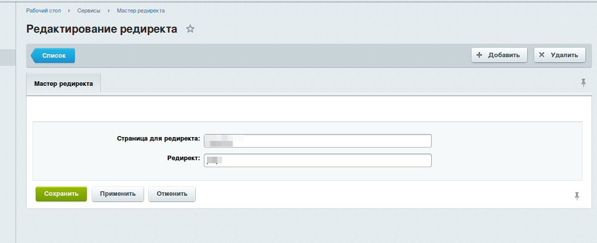 В разделе «Список редиректов» нажмите кнопку «Добавить». В открывшейся форме укажите: