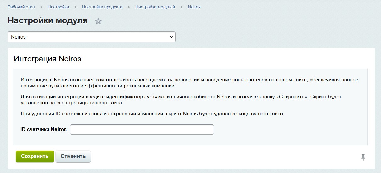 Интеграция Neiros — это простой и эффективный модуль для подключения сервиса аналитики Neiros к вашему сайту на 1С-Битрикс. Модуль позволяет автоматизировать процесс добавления JS-скрипта проекта Neiros, благодаря чему вы сможете: