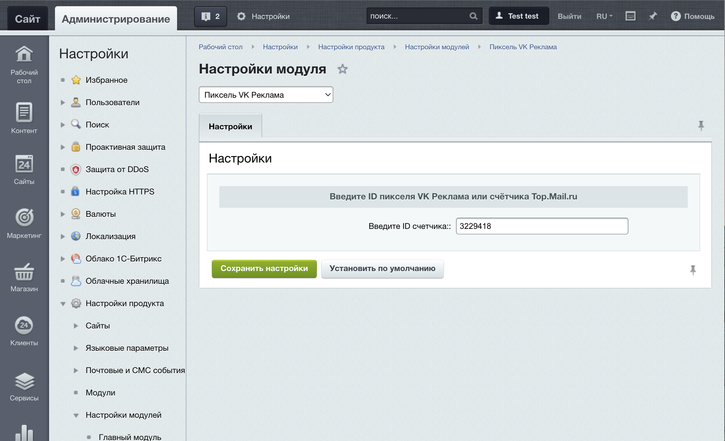 - Перейдите в раздел "Настройки" -> Настройки продукта -> Настройки модулей -> Пиксель VK Реклама