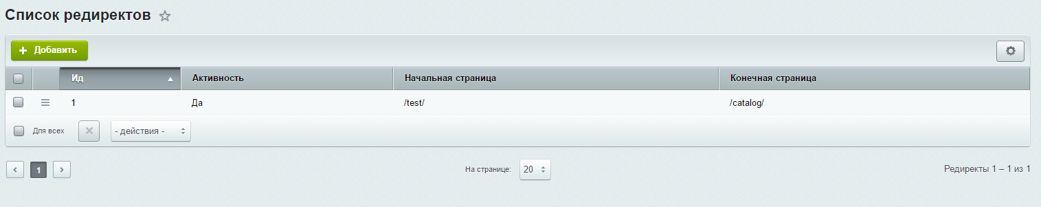 2. В административном разделе сайта появиться страница в разделе Контент -> Редиректы -> Список редиректов. На этой странице нажмите на кнопку "Добавить".