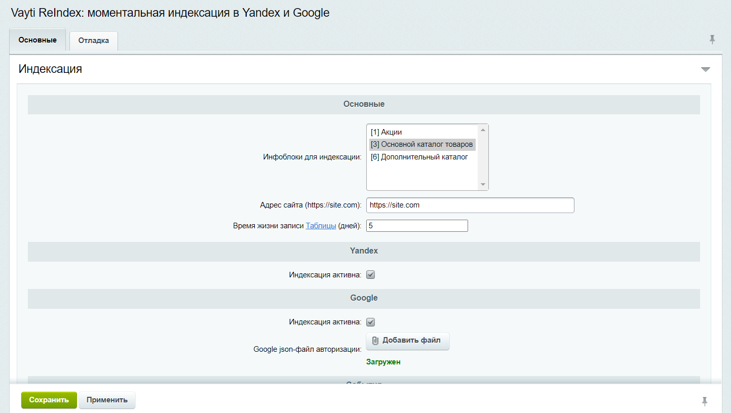 Решение индексирует товары и разделы выбранного инфоблока методами Yandex Indexnow и Google Indexing.