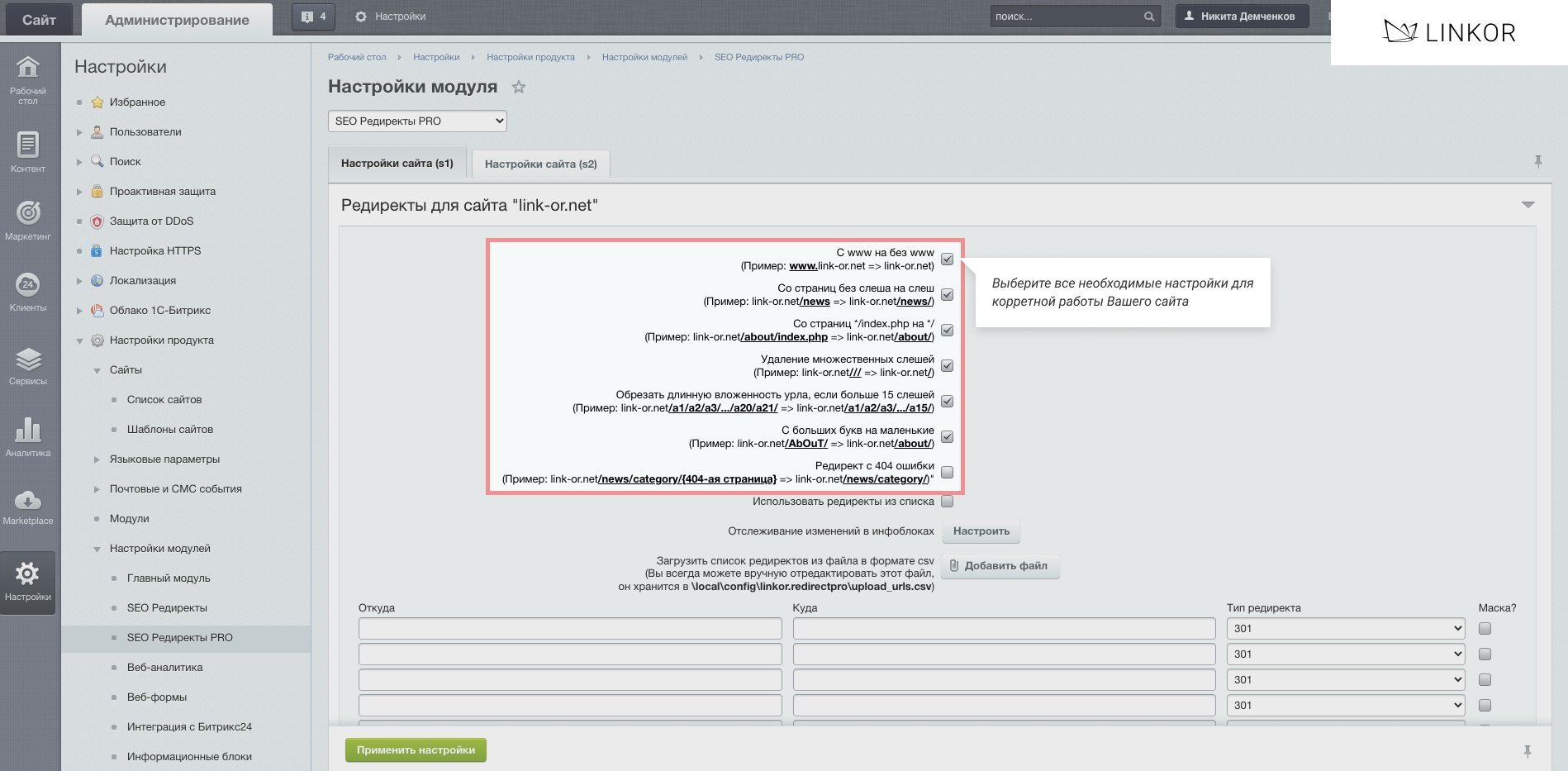 Для типовых редиректов достаточно просто проставить нужные галочки и применить настройки.