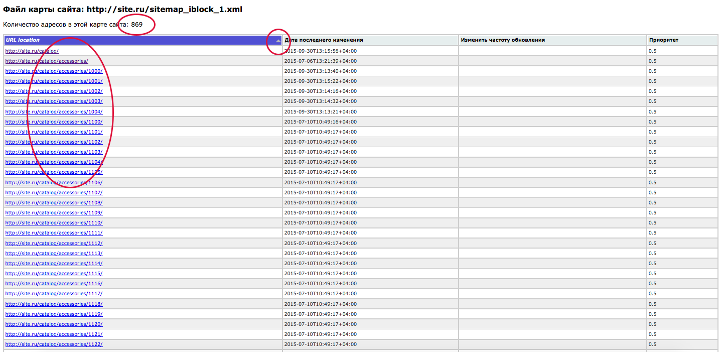 - Отображение индексного и дочерних файлов карты сайта для поисковых систем в табличном виде;