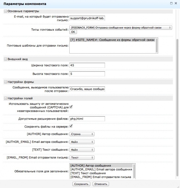 Данный компонент позволяет Вам разместить на сайте настраиваемую форму отправки сообщений на E-mail. Поля формы автоматически подгружаются из выбранного типа почтового события и остается только настроить компонент.