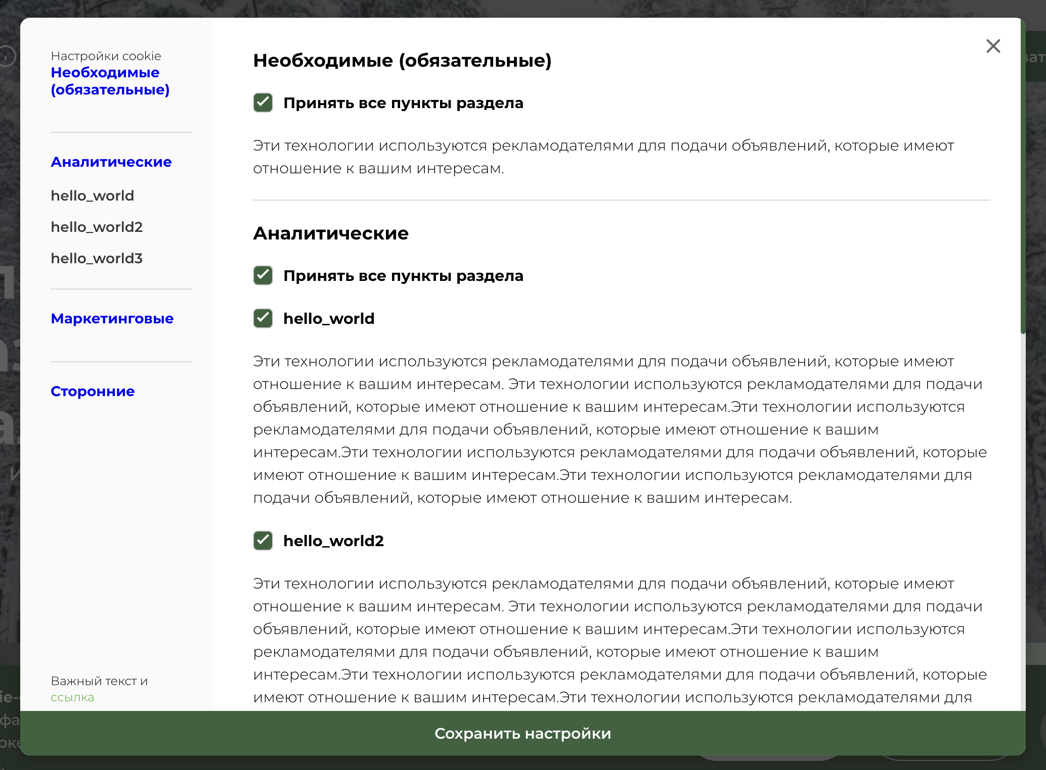 Баннер согласия с выбором категорий cookie