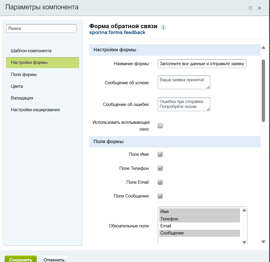 ВНИМАНИЕ! Если вы убрали отображение и обязательность какого-то из полей, а оно по прежнему требует заполнения, то проверьте настройки свойств нового типа инфоблока "Формы Sporina"