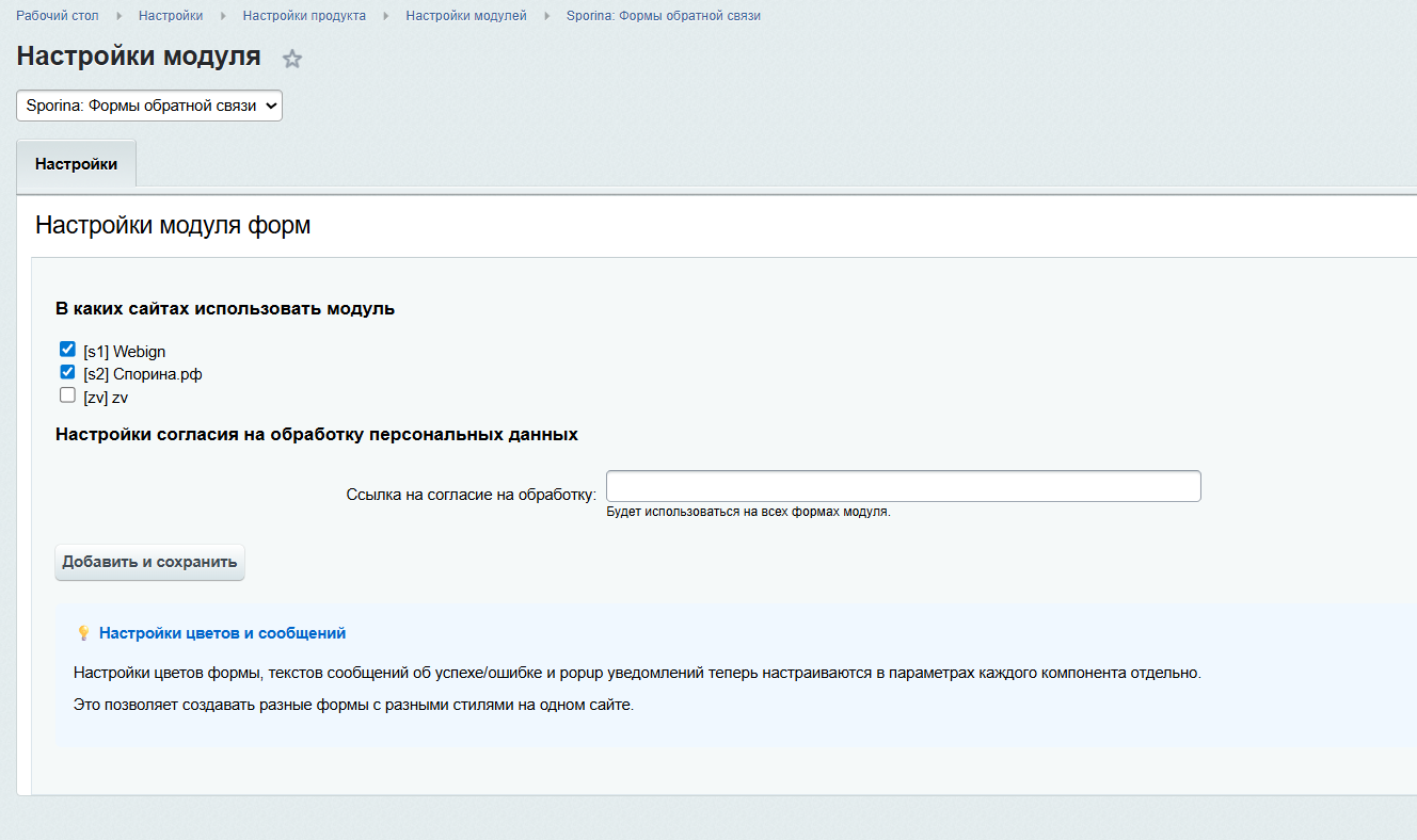 - Перейдите в настройки модуля: Рабочий стол->Настройки->Настройки продукта->Настройки модулей->Sporina: Формы обратной связи