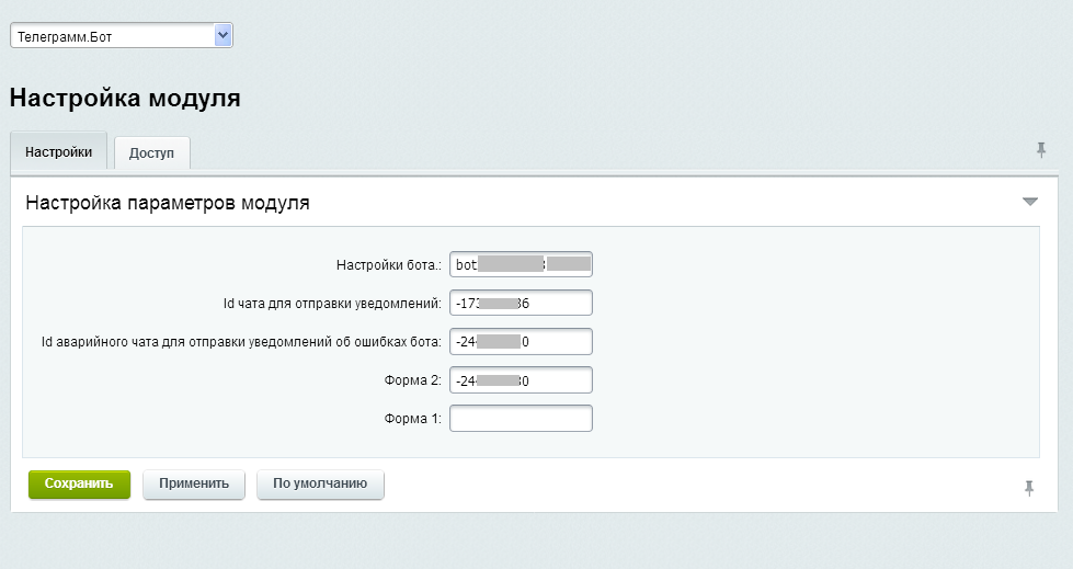 - Укажите строку настройки бота в формате "id бота:токен" (полученную при создании бота в телеграмме), это самая важная настройка, общая для модуля.