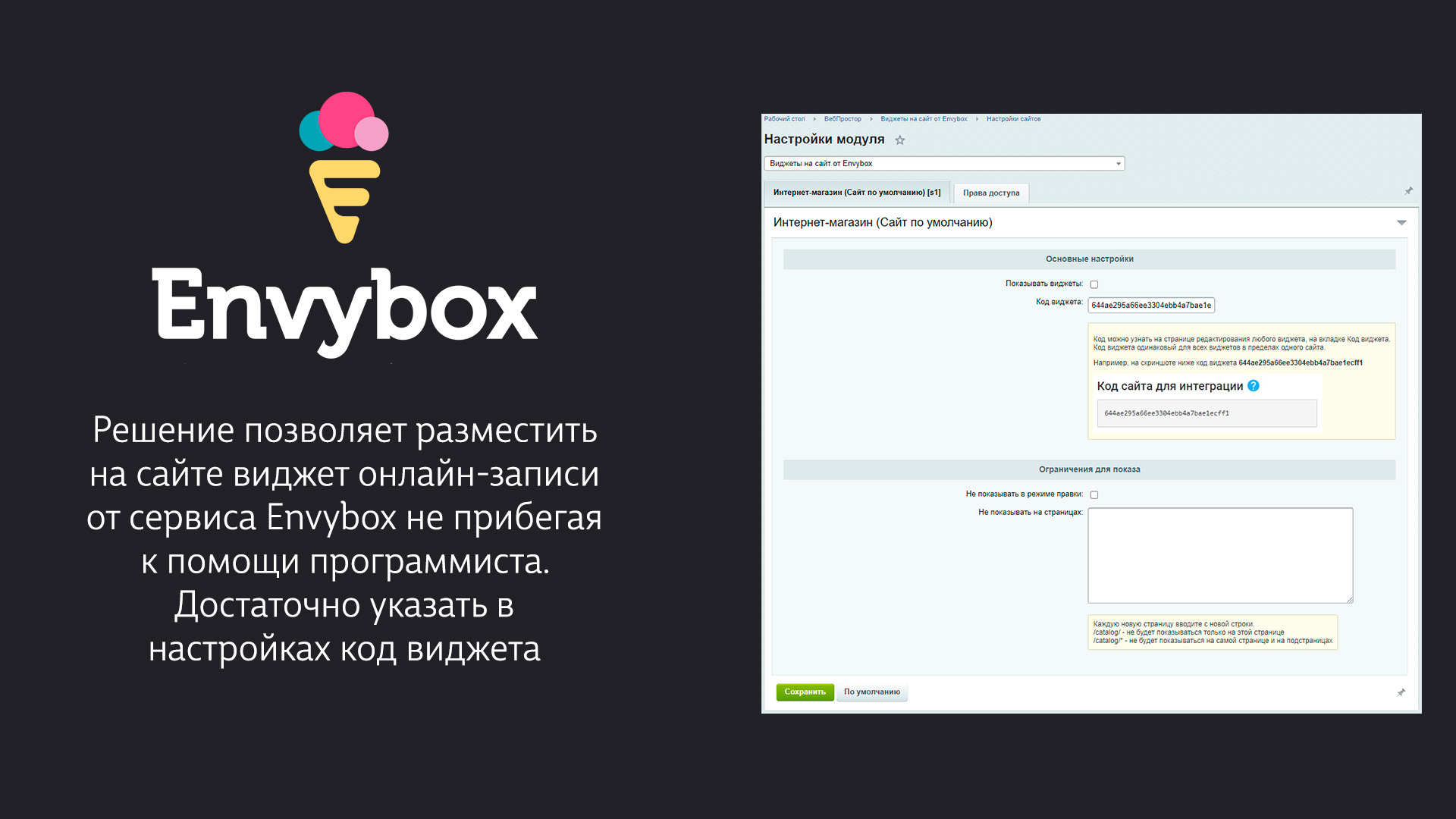Указать код виджета. Можно найти в личном кабинете сервиса Энвибокс на странице редактирования любого виджета, на вкладке Код виджета. Активировать опцию «Показывать виджеты».