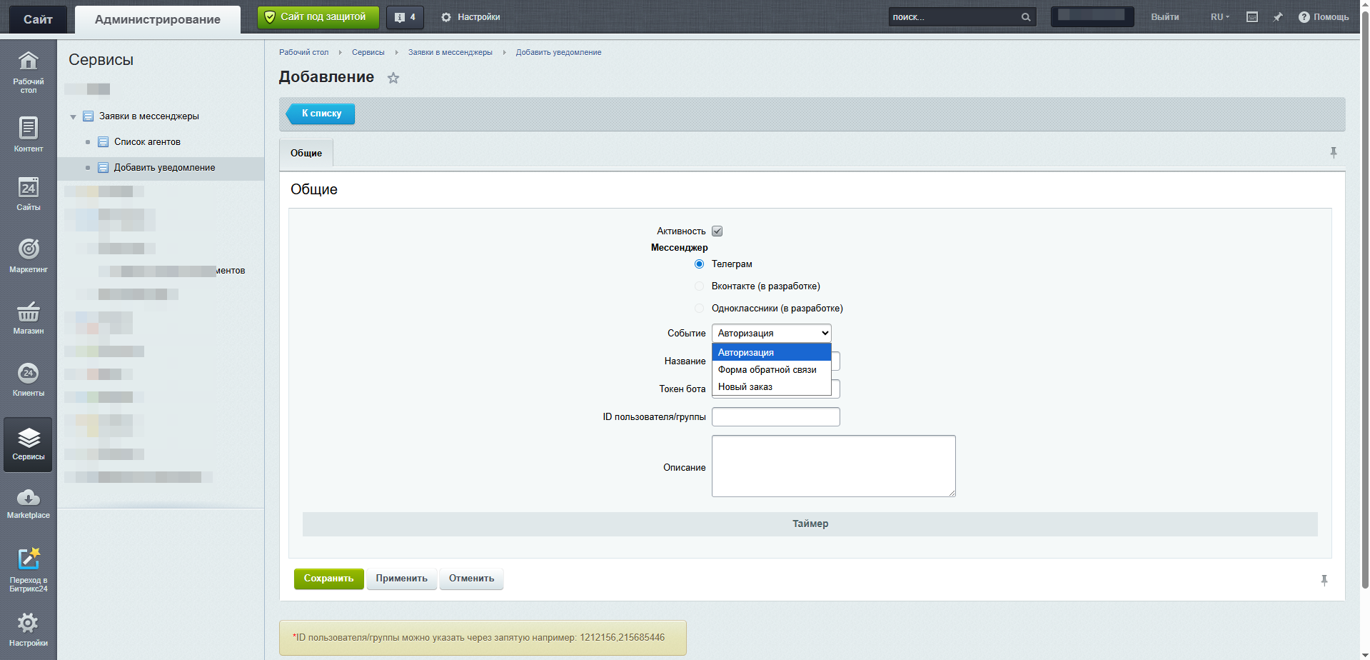 Модуль заявок в мессенджеры для сайта на Bitrix удобный инструмент интеграции взаимодействия пользователей с сайтом и популярных платформ мгновенных сообщений, таких как Telegram, Viber, OK, VK .