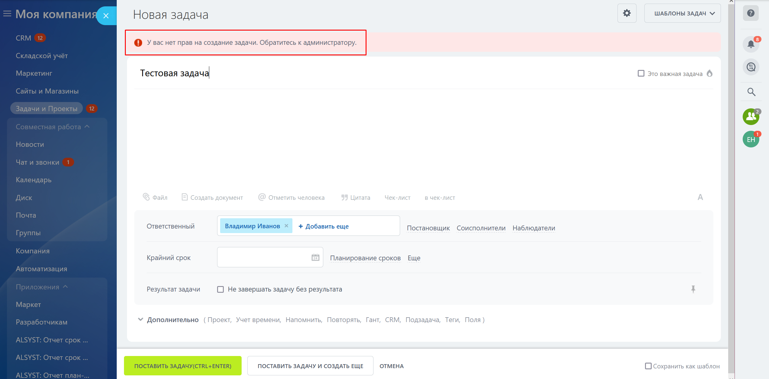 2. Пользователям, которым запрещено создавать задачи, выводить уведомление "У вас нет прав на создание задачи. Обратитесь к администратору.".