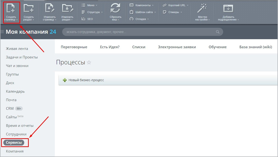 1. Если у вас на портале нет страницы, отражающий бизнес-процессы, нужно её создать и вынести туда компонент «Бизнес-процесс» (bitrix:bizproc.wizards).