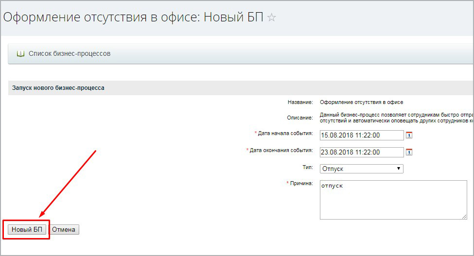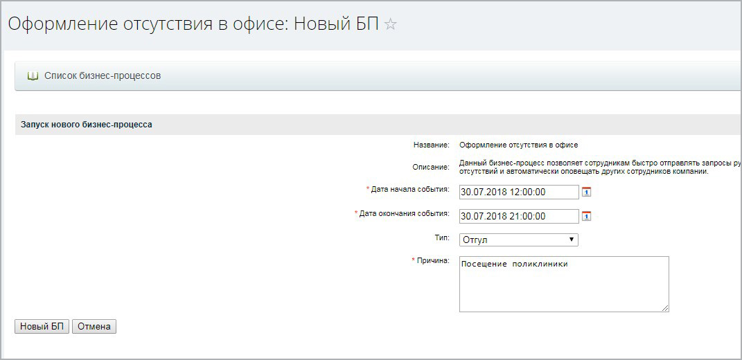 Данный бизнес-процесс позволяет пользователям отправлять запросы на отсутствие в офисе.