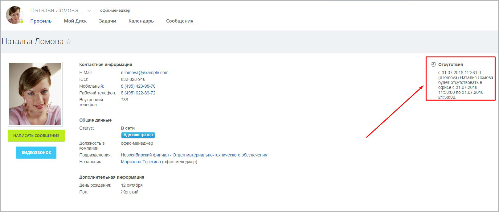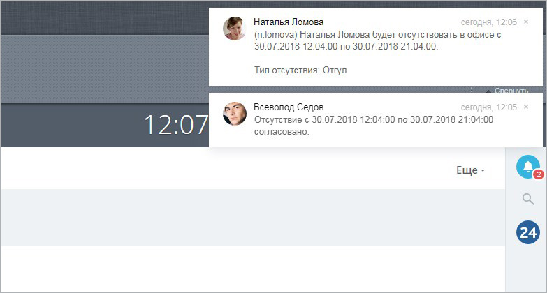 Когда директор согласует отсутствие, происходит следующее: в профиле сотрудника на портале отмечается время отсутствия и коллегам высылается почтовое уведомление на указанный в настройках почтовый ящик о том, кто и когда будет отсутствовать. Также публикуется новость в Живую ленту.