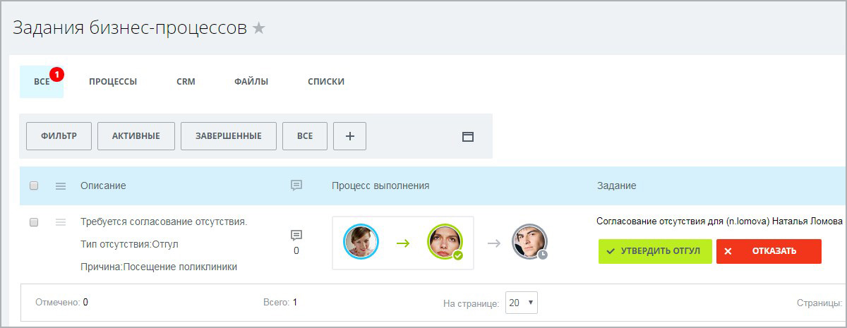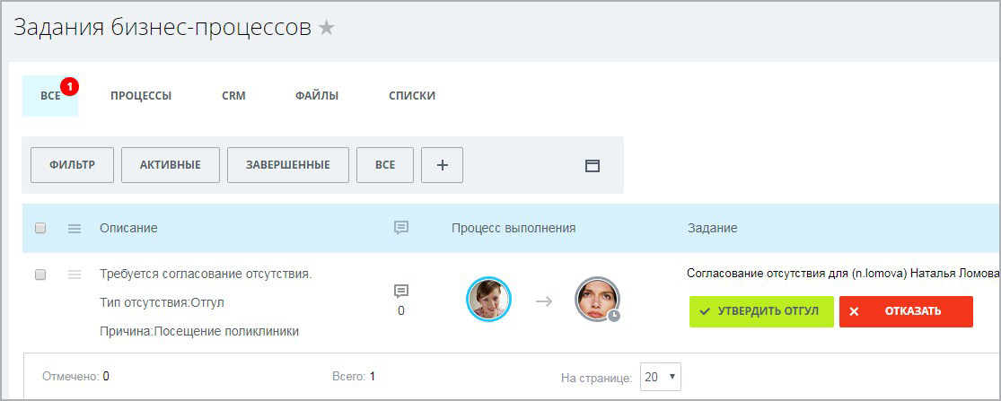 С помощью этого бизнес-процесса пользователи портала могут оформлять разного вида отсутствия на рабочем месте — отгул, командировка, удалённая работа, больничный и т.д. с указанием начала и окончания отсутствия. Каждая заявка согласуется непосредственным руководителем сотрудника, а затем вышестоящим руководством. Когда отсутствие согласовано всей руководящей цепочкой, пользователь получает уведомление о том, что его заявка одобрена, а коллеги могут ознакомиться с этой информацией в Живой ленте.