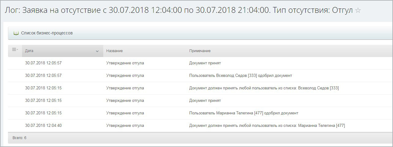 Если заявка на отгул создана пользователем с должностью «директор», она по умолчанию считается согласованной и закрывается, а если кем-то из других сотрудников, то автоматически отправляется запрос руководителю автора заявки с просьбой её согласовать. Когда руководитель согласует отсутствие, заявка уходит на согласование на уровень выше, и так пока не дойдет до директора. Любой руководитель из цепочки согласования может отказать в предоставлении отгула.