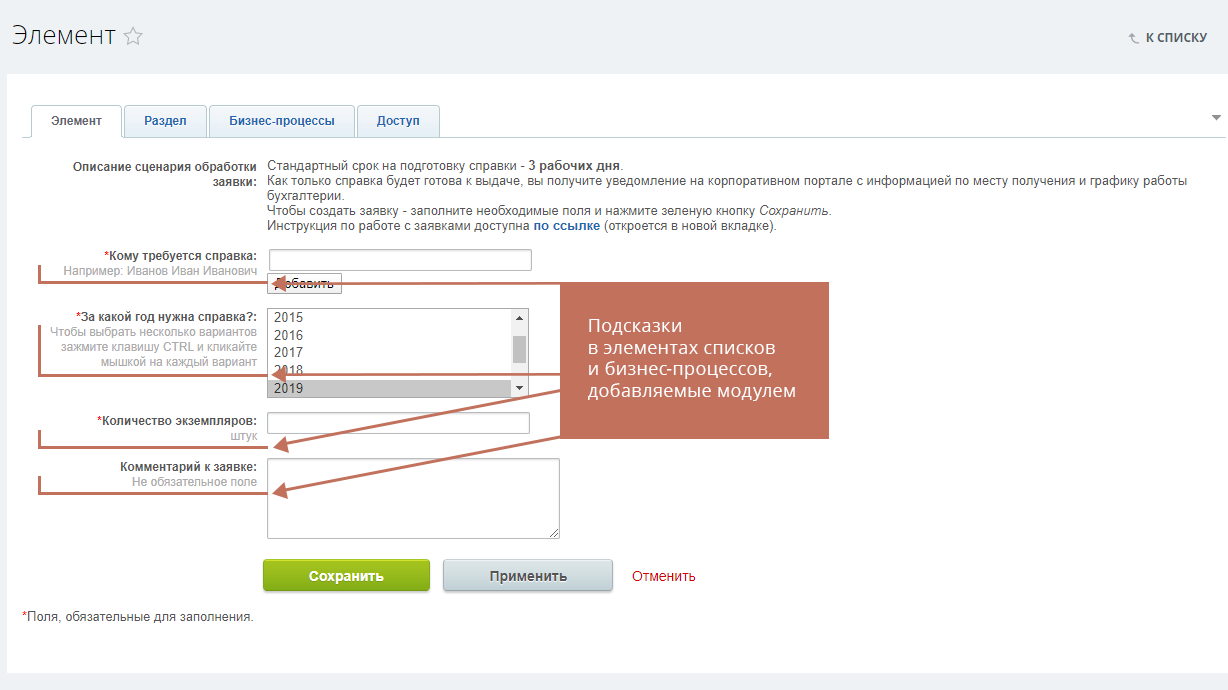 Подсказки отображаются только при добавлении/просмотре/редактировании карточки элемента списка или карточки бизнес-процесса(процесса в ленте).