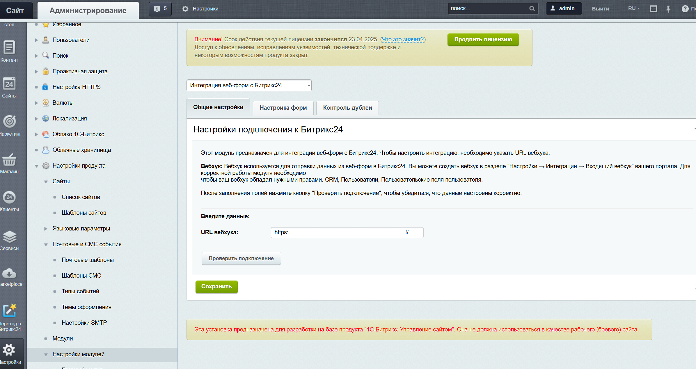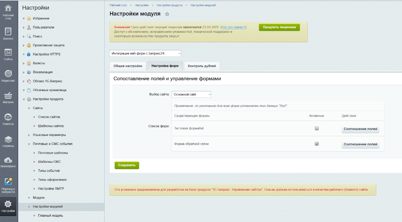 2. После установки модуля, перейдите в настройки модуля и настройте подключение к вебхуку, активность формы, соотношение полей и тд. По вопросам модуля и интеграций пишите на t.me/kuratov_bot