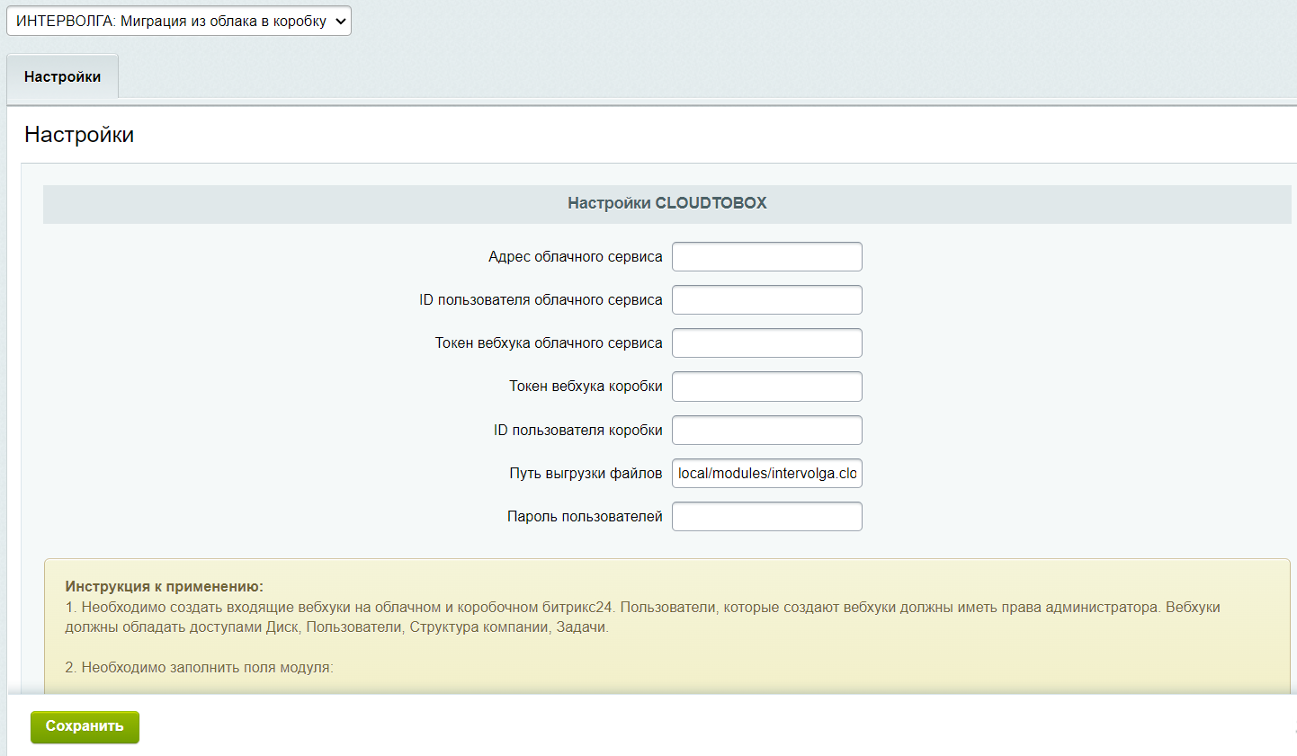 Модуль позволяет мигрировать данные из облачного Битрикс24 в коробочный.
