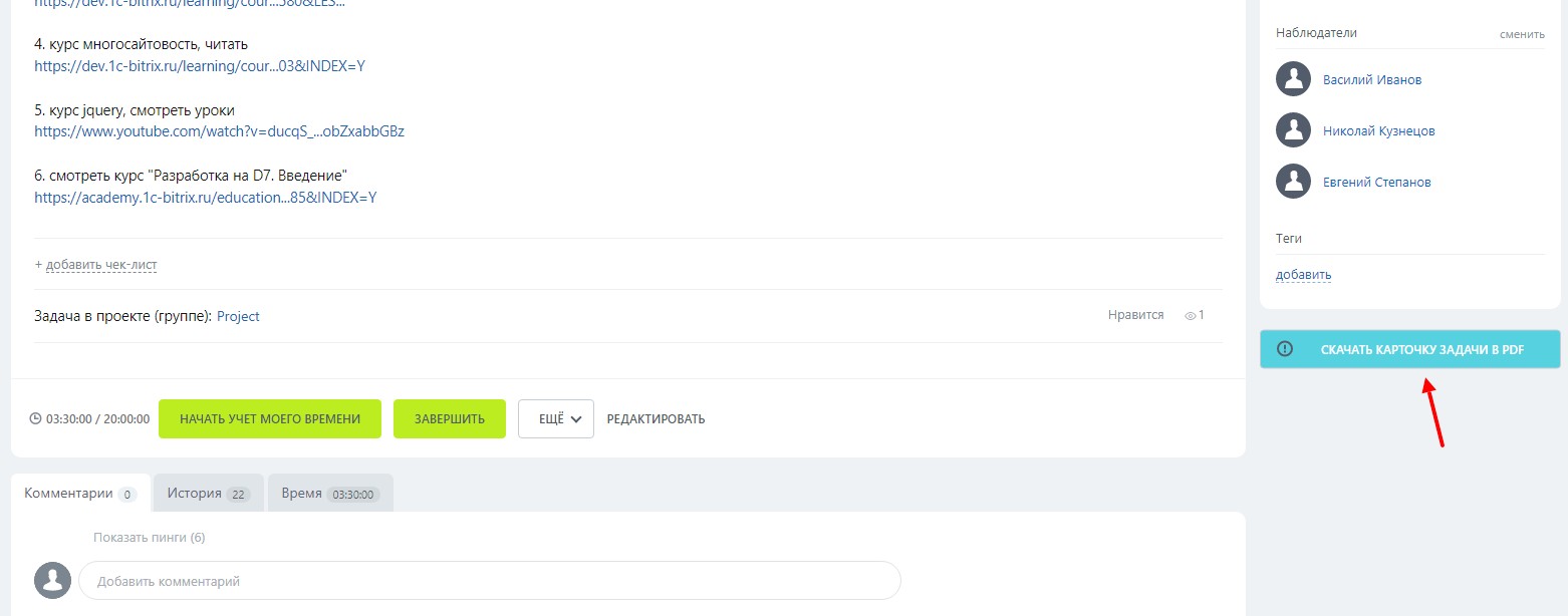 Решение позволяет скачать карточку задачи в виде pdf файла.
