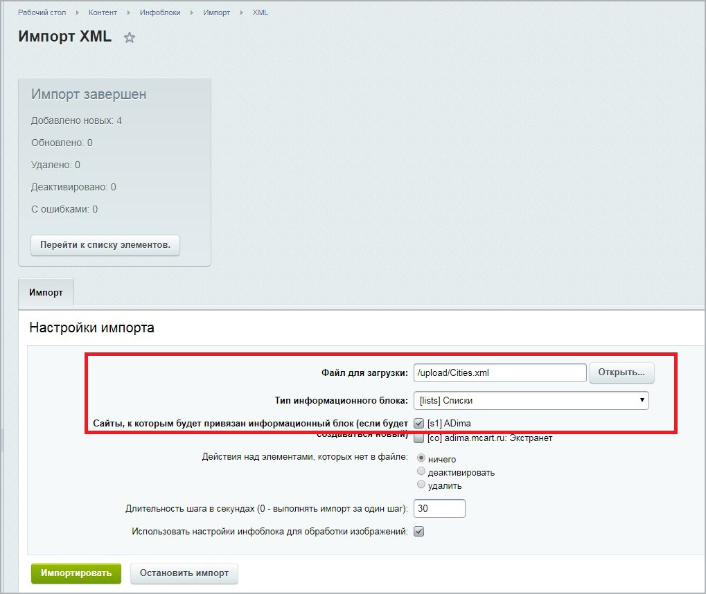 3) Перейдите на портал-приемник, куда нужно скопировать список. Загрузите файл с данными в структуру портала. В административной части выберите раздел Контент — Инфоблоки — Импорт — XML. Укажите путь к загруженному файлу, в поле «Тип информационного блока» выберите «Списки [lists]».