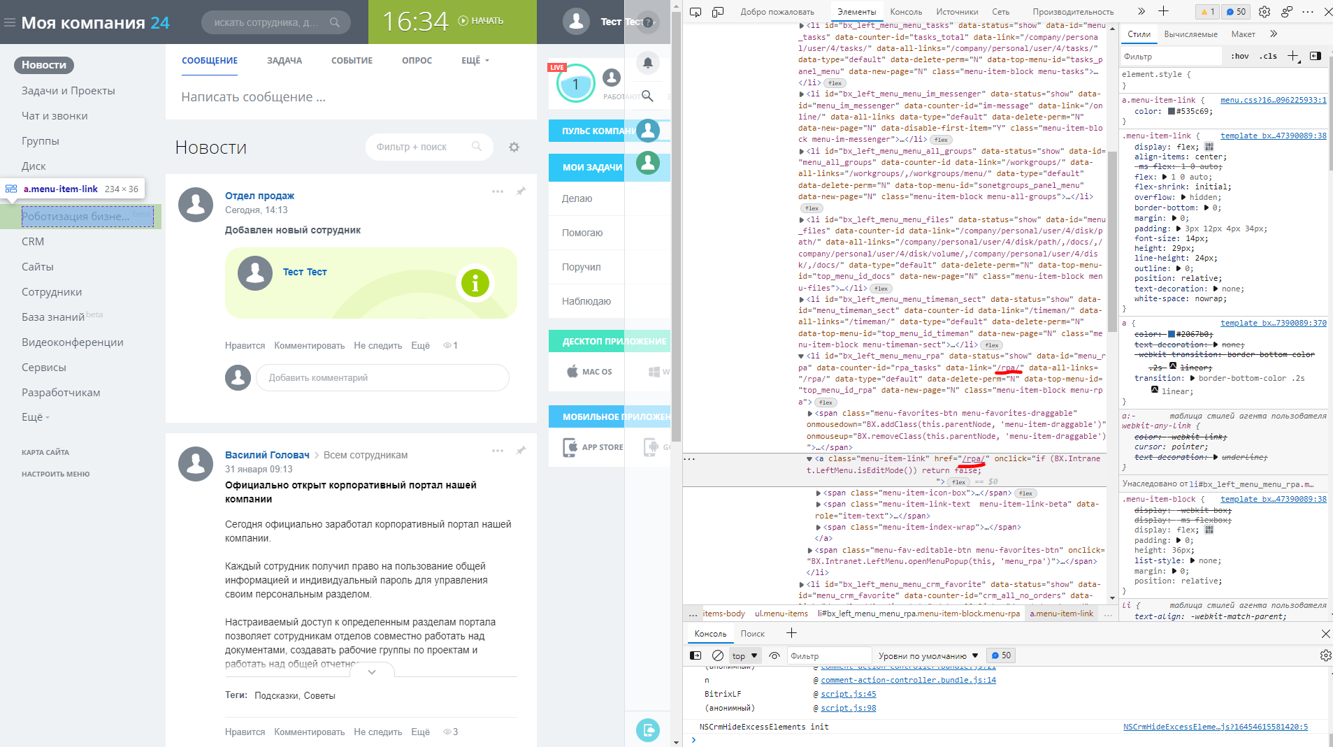 После установки можно будет перейти к настройке. Например, нужно скрыть/удалить пункт меню "Календарь". Для этого переходим на публичную часть сайта, находим нужный пункт меню, далее нам нужно получить его id или ссылку, их можно посмотреть в коде (в родительском li блоке в атрибуте "data-id" для id или в атрибуте data-link для ссылки).