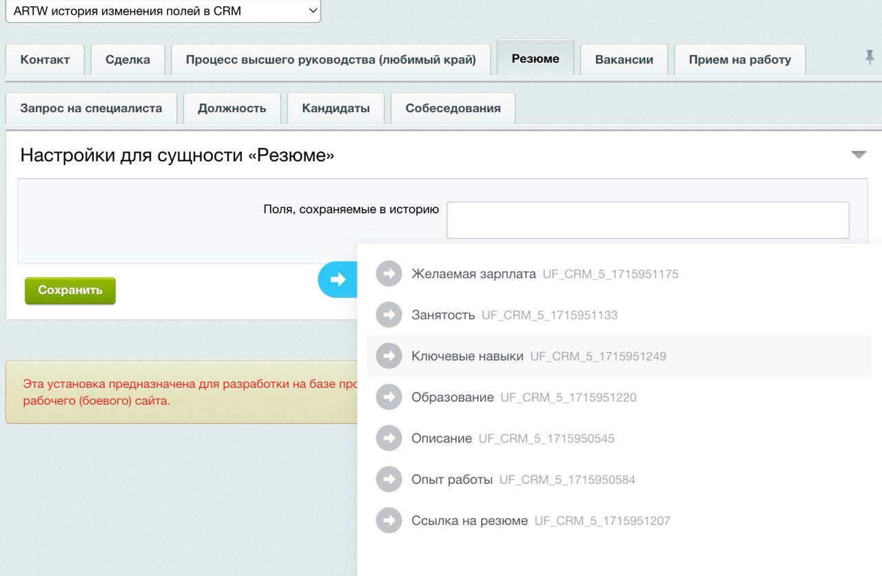 В настройках модуля можно выбрать только те поля и сущности CRM, по которым необходимо отображать историю изменений. Вкладка с CRM сущностью в настройках модуля будет отображаться только при наличии в ней пользовательских полей.