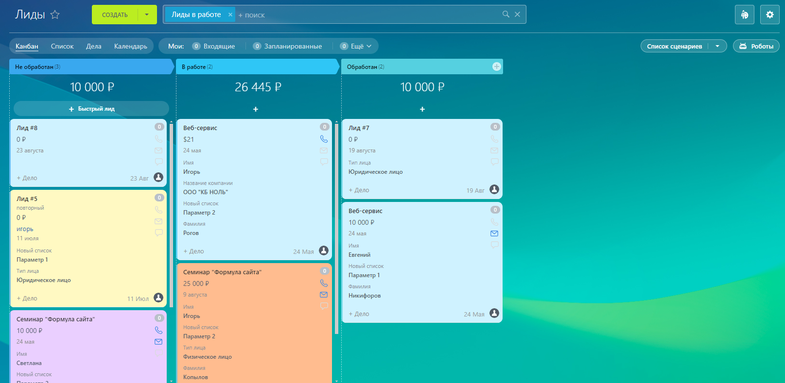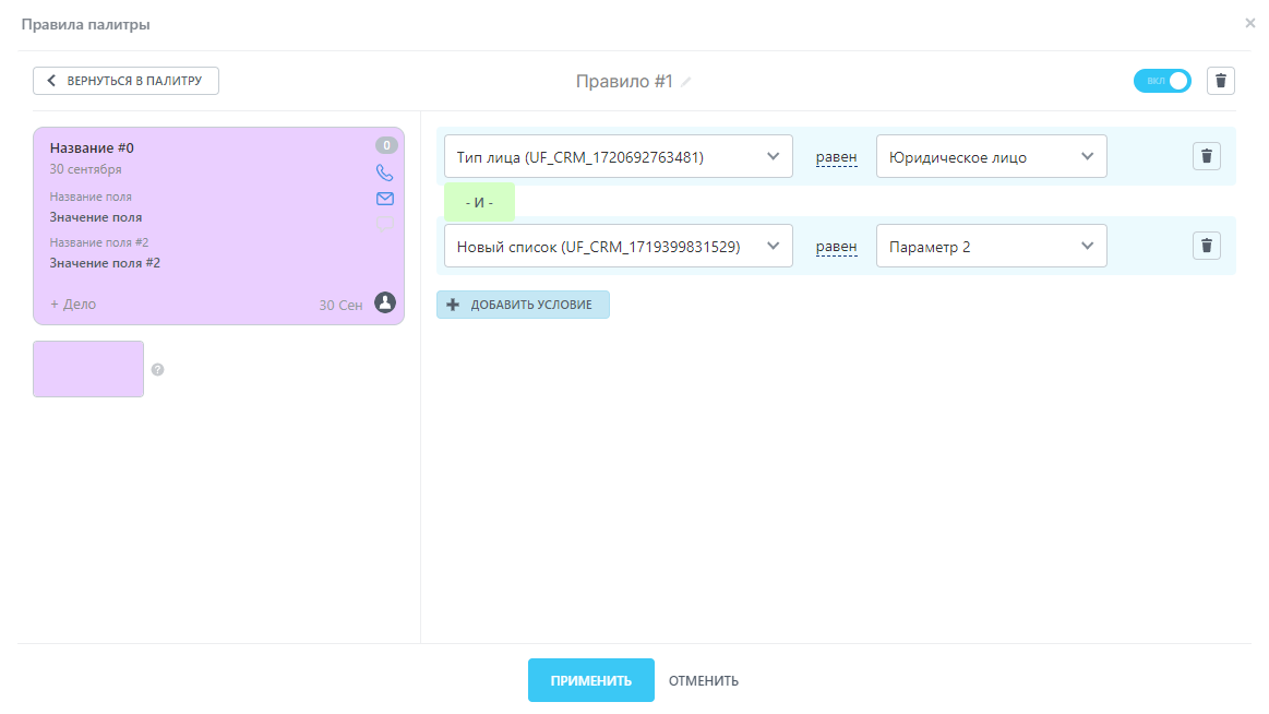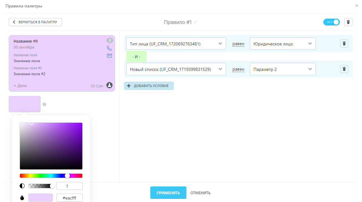 Модуль предназначен для настройки цвета заливки карточек сущностей в режиме отображения "Канбан" и "Список" в разделе CRM. Пользователи могут задавать правила, на основе которых карточки будут окрашиваться в определенные цвета.