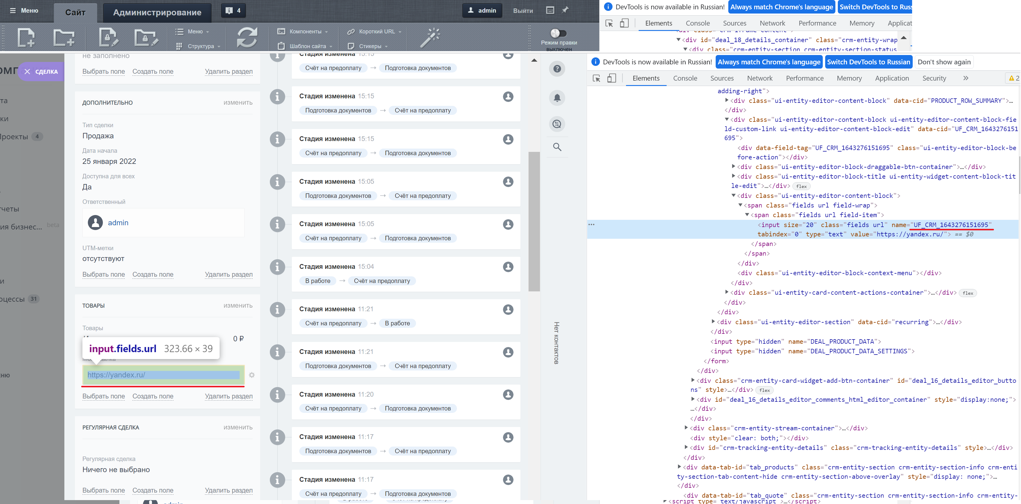 После установки можно будет перейти к настройке. Например, нужно при установке сделке стадии "В работе" открывалось новая вкладка с нужным адресом. Для этого переходим в CRM -> Сделки -> Добавить/Изменить сделку, находим нужную стадию, например, стадия "В работе", нужно получить его id, его можно посмотреть в коде (в родительском div блоке в атрибуте "data-id") страницы сделки, для поля "В работе" id = 'С1:EXECUTING'.