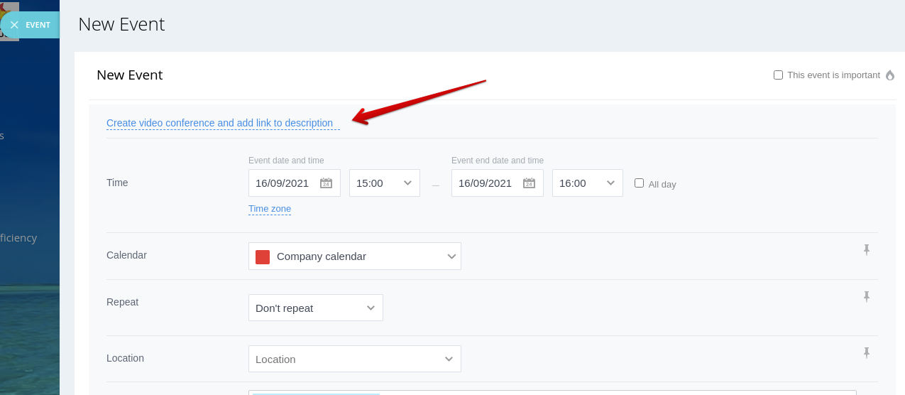 Создать видеоконференцию в Битрикс24 и вставить ссылку на нее при в событие календаря, CRM, или новое почтовое сообщение. Ссылка вставляется в поле "Описание" события или в текст письма.
