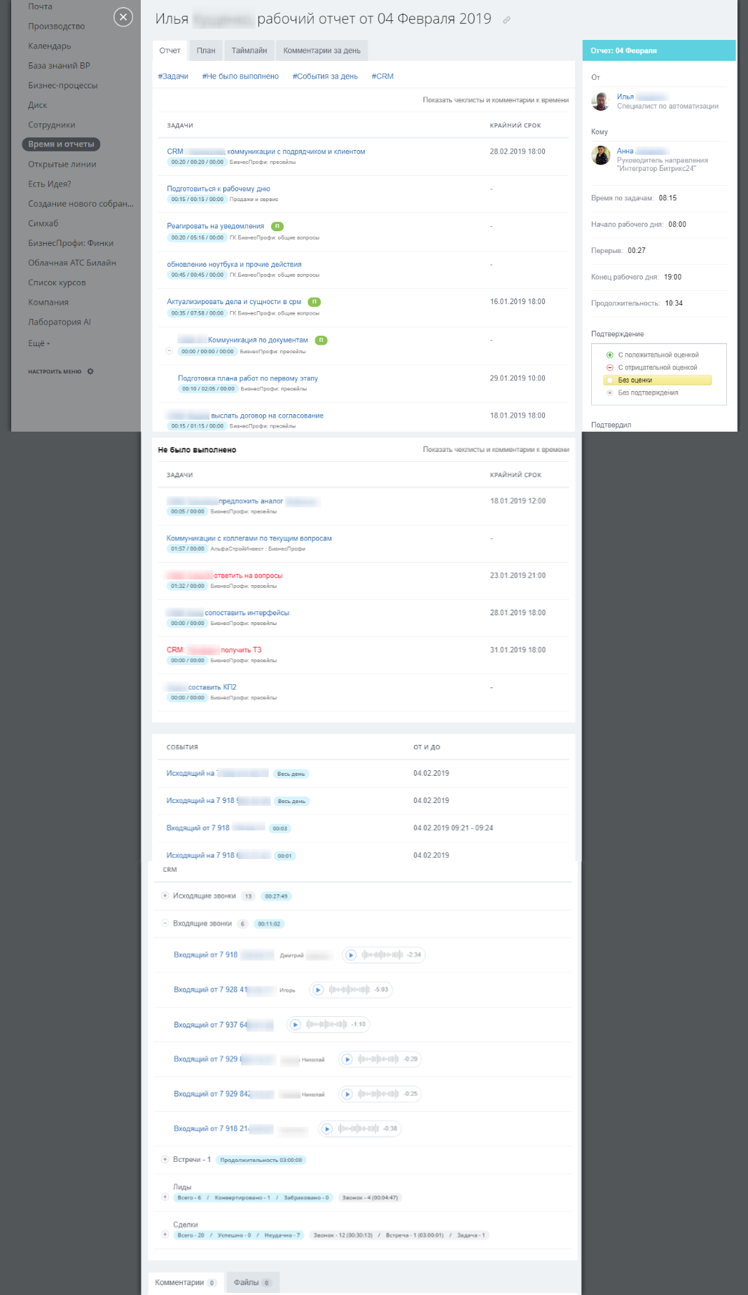 В отчете видны все задачи, которыми занимался сотрудник в течение дня, план на завтра, время переключения между задачами(таймлайн), комментарии ко всем задачам, которые вошли в отчет, все входящие и исходящие звонки за день, встречи и сделки из CRM.