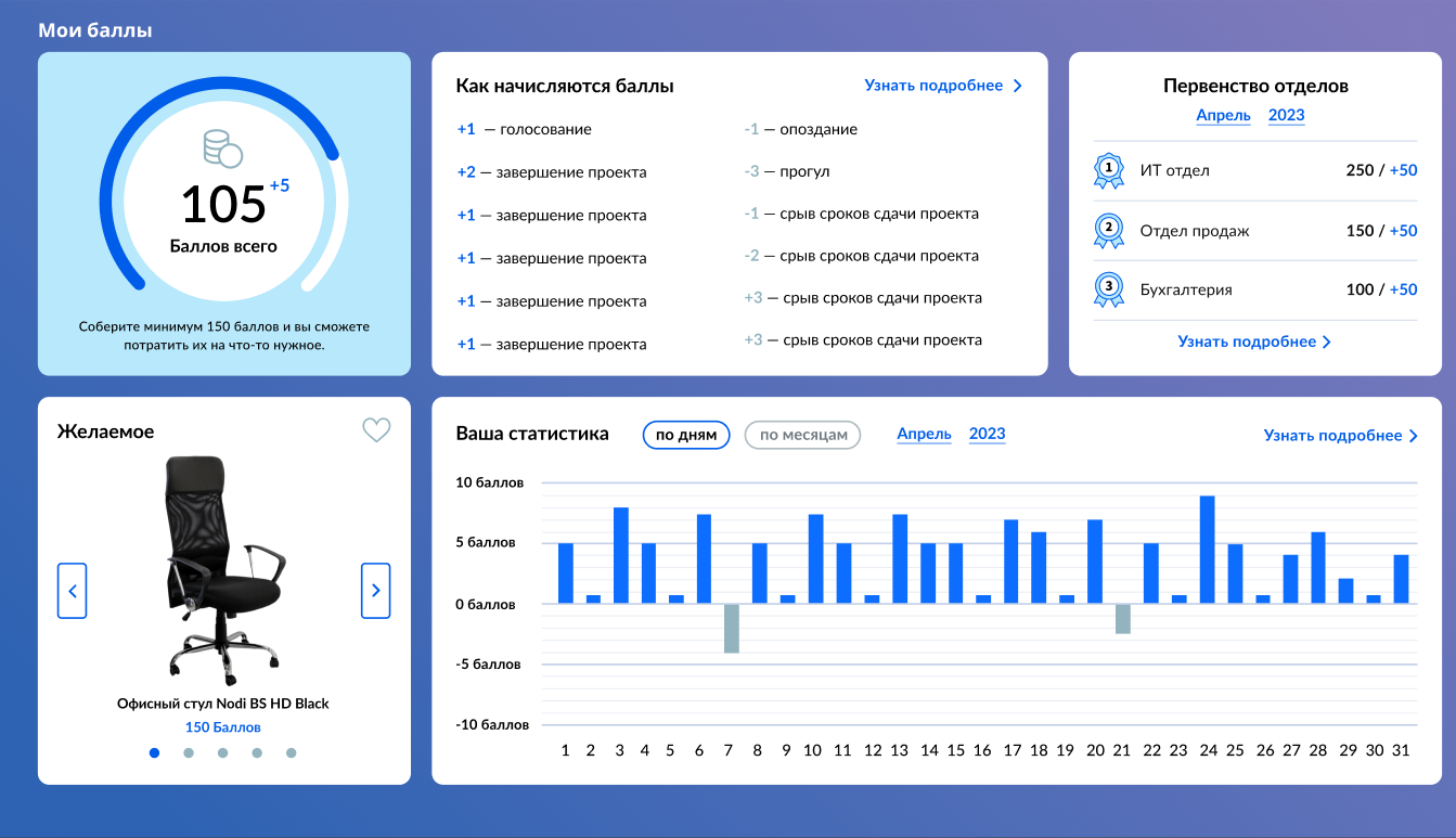 Гибкость настройки: Руководители могут самостоятельно задавать критерии и правила начисления баллов, что позволяет адаптировать систему под конкретные цели и задачи компании.