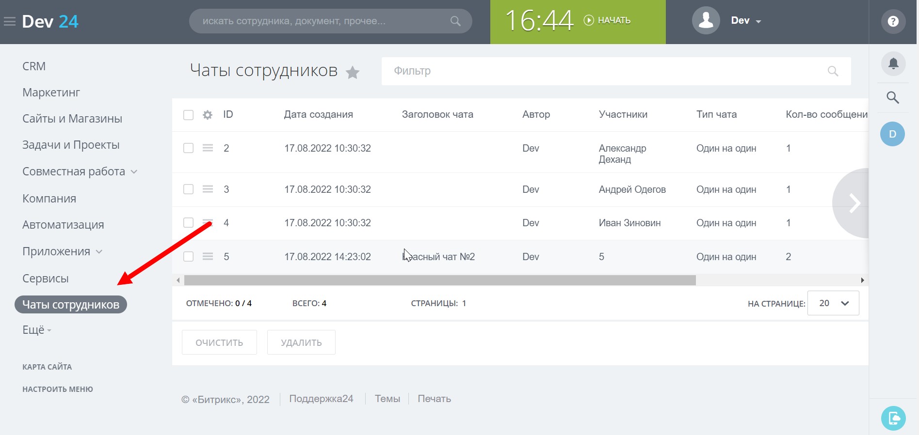 Полная очистка чатов сотрудников