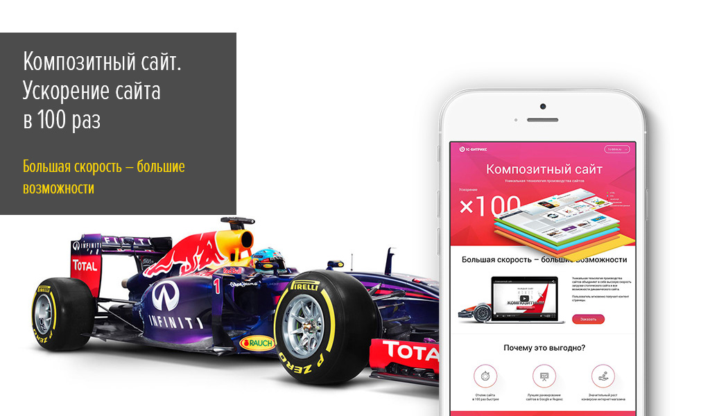 Уникальная технология производства сайтов - «Композитный сайт» - объединяет в себе высокую скорость загрузки статического сайта и все возможности динамического сайта.