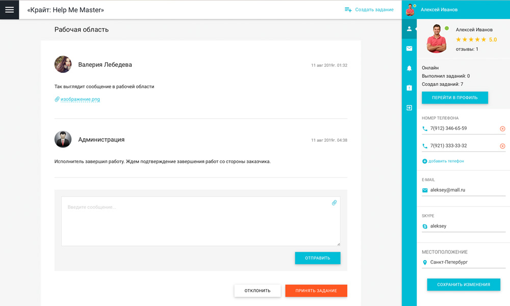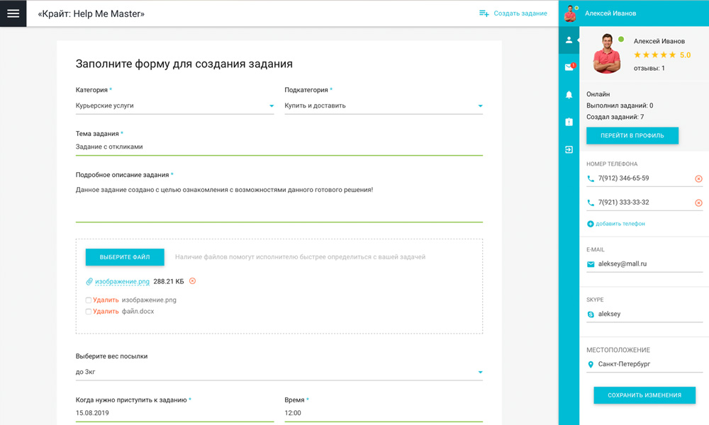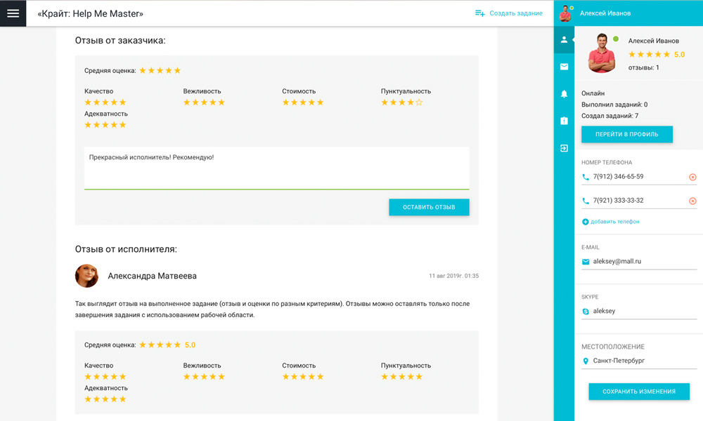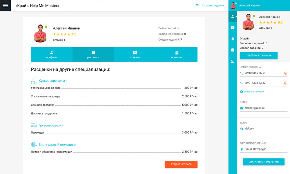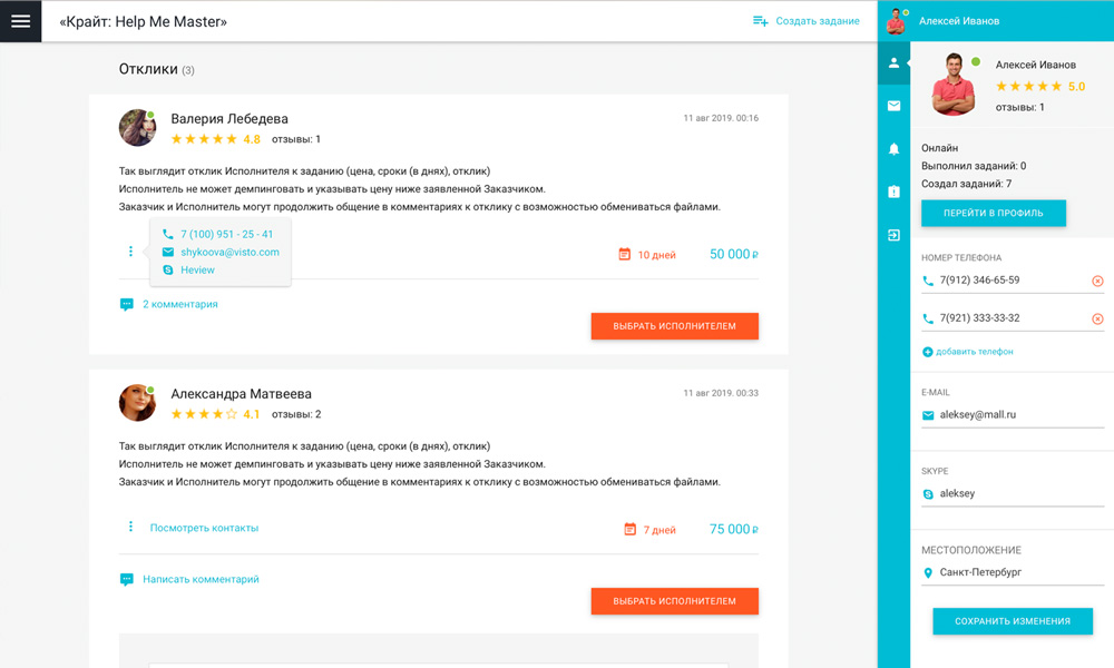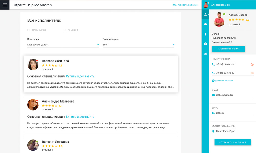 Сервис «Крайт: HelpMeMaster» позволяет находить специалистов и помощников для решения бытовых и бизнес-задач. Заказчикам — найти исполнителя, разместить проект или вакансию. Исполнителям — создать портфолио, найти проект и предложить услуги. С помощью отраслевого решения «Крайт: HelpMeMaster» вы сможете запустить сервис поиска исполнителей, биржу фриланса, портал проектов и услуг, сервис поиска специалистов , мастеров , помощников, сервис поиска работы, сервис поиска переводчиков, сервис поиска попутчиков, биржу прроектов и услуг. Хотите запустить успешный сервис? или позвоните 8 (800) 555-13-01 (бесплатно) |