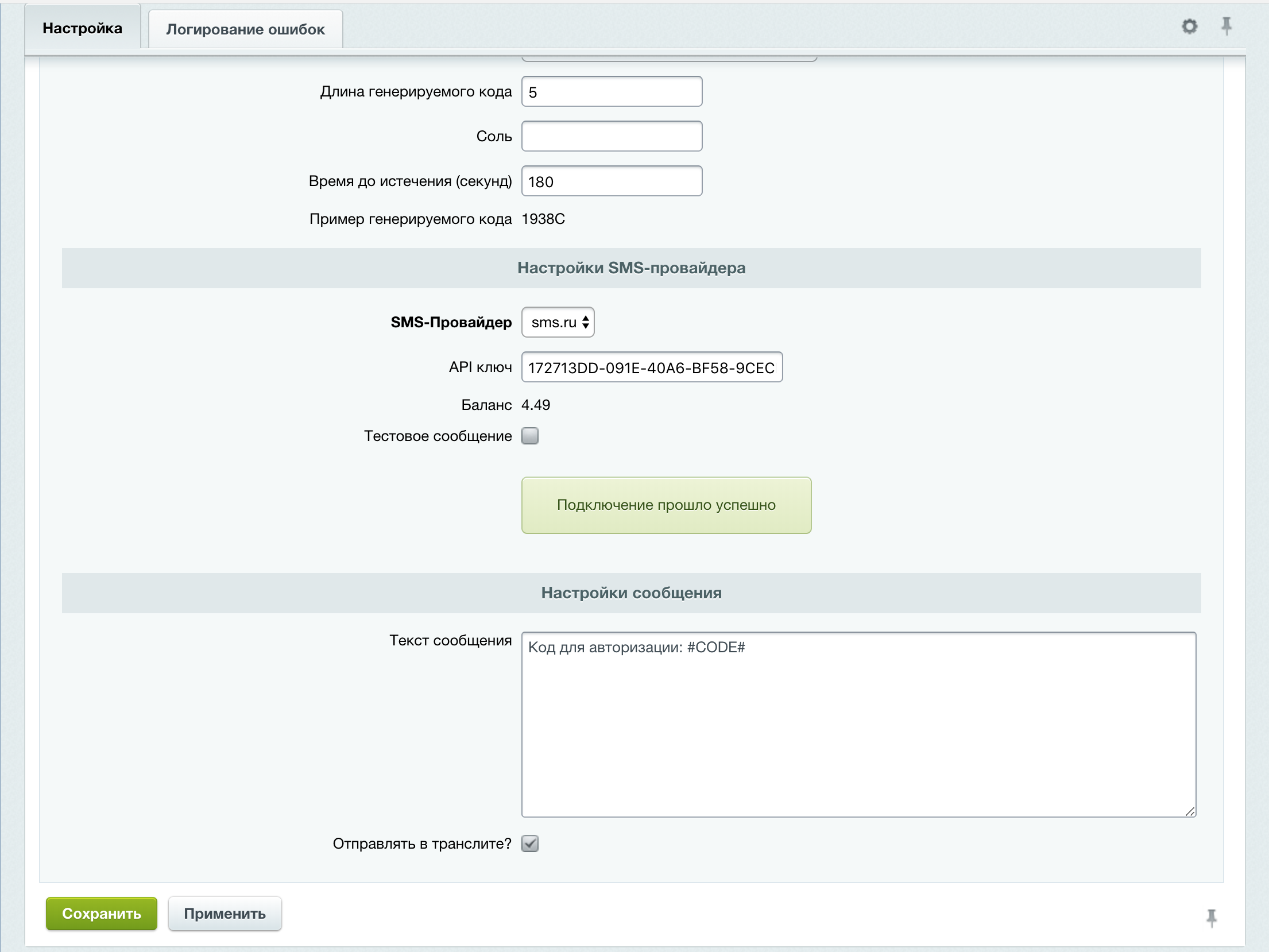 - Переходим в настройки модуля: Настройки → Настройки продукта → Настройки модулей → Авторизация через SMS;