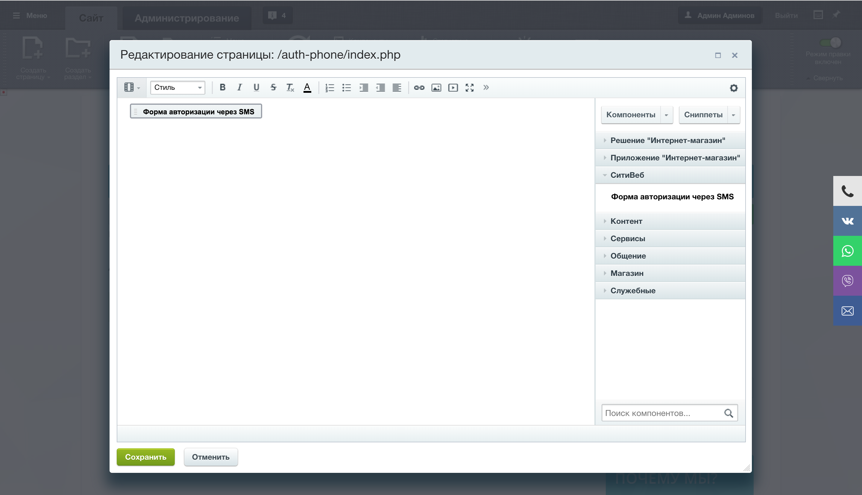 - Через стандартный визуальный редактор устанавливаем компонент на страницу и производим его настройку;