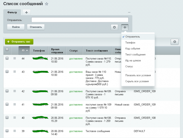 - заказ в панели администрирования содержит историю всех отправленных сообщений по данному заказу, а также позволяет отправить произвольное смс в ручном режиме.