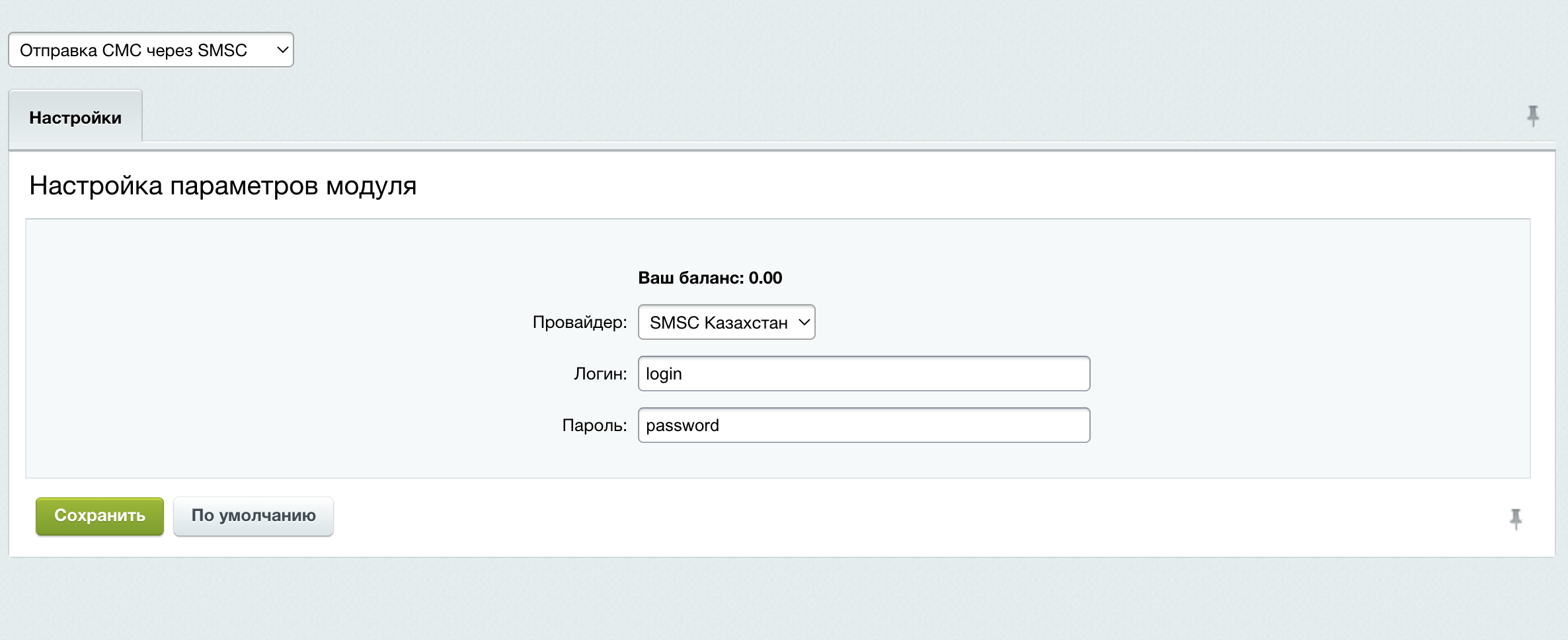 Выберите провайдера отправки СМС сообщений "Россия" или "Казахстан", а также укажите логин и пароль для авторизации в SMSC, которые вы указали при регистрации.