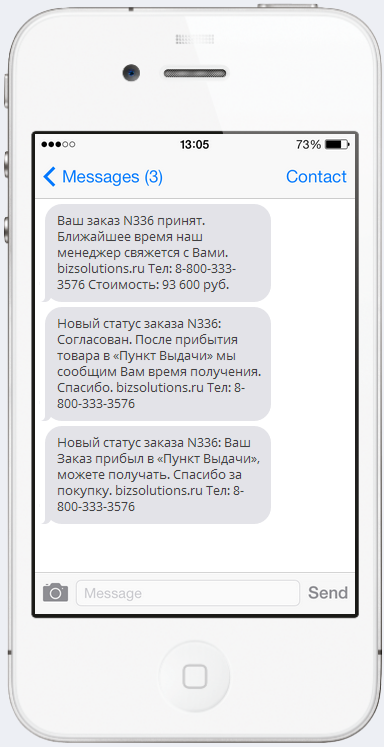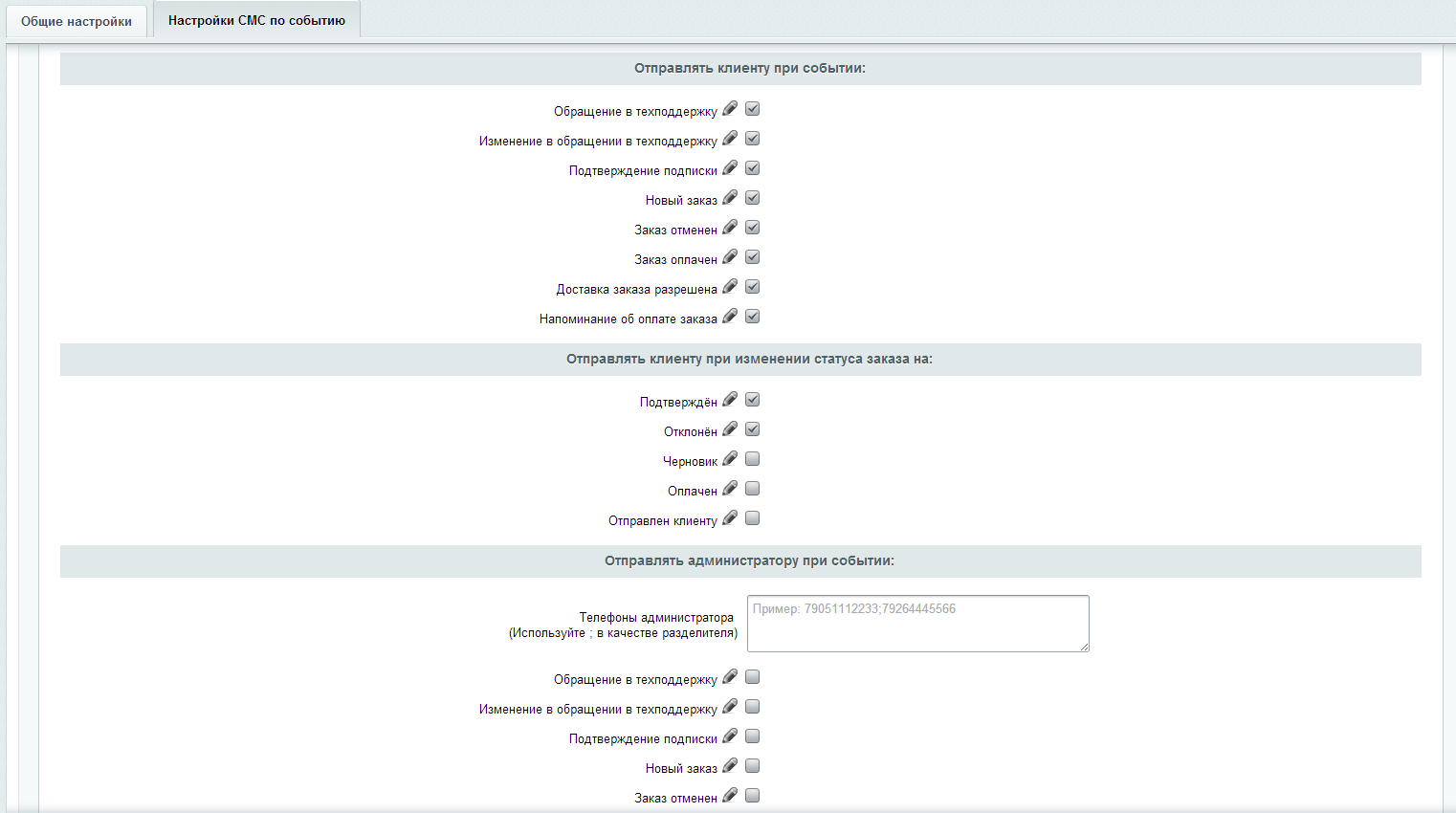 Рассылка SMS по событиям интернет-магазина (создание, изменение заказа, оповещение об ожидающем оплаты заказа). Настройка рассылки как для администратора сайта, так и для клиента, сделавшего заказ.