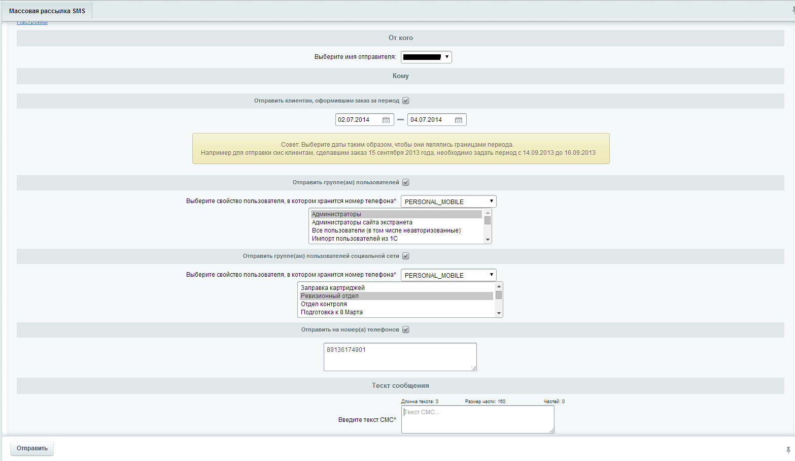 Организация простой, единовременной рассылки SMS, в которой адресатом можно указать как список номеров телефонов, так и группу пользователей сайта. В последнем случае телефон пользователей будет браться из ранее выбранного поля из личного кабинета пользователя. - Рассылка по событиям интернет-магазина.