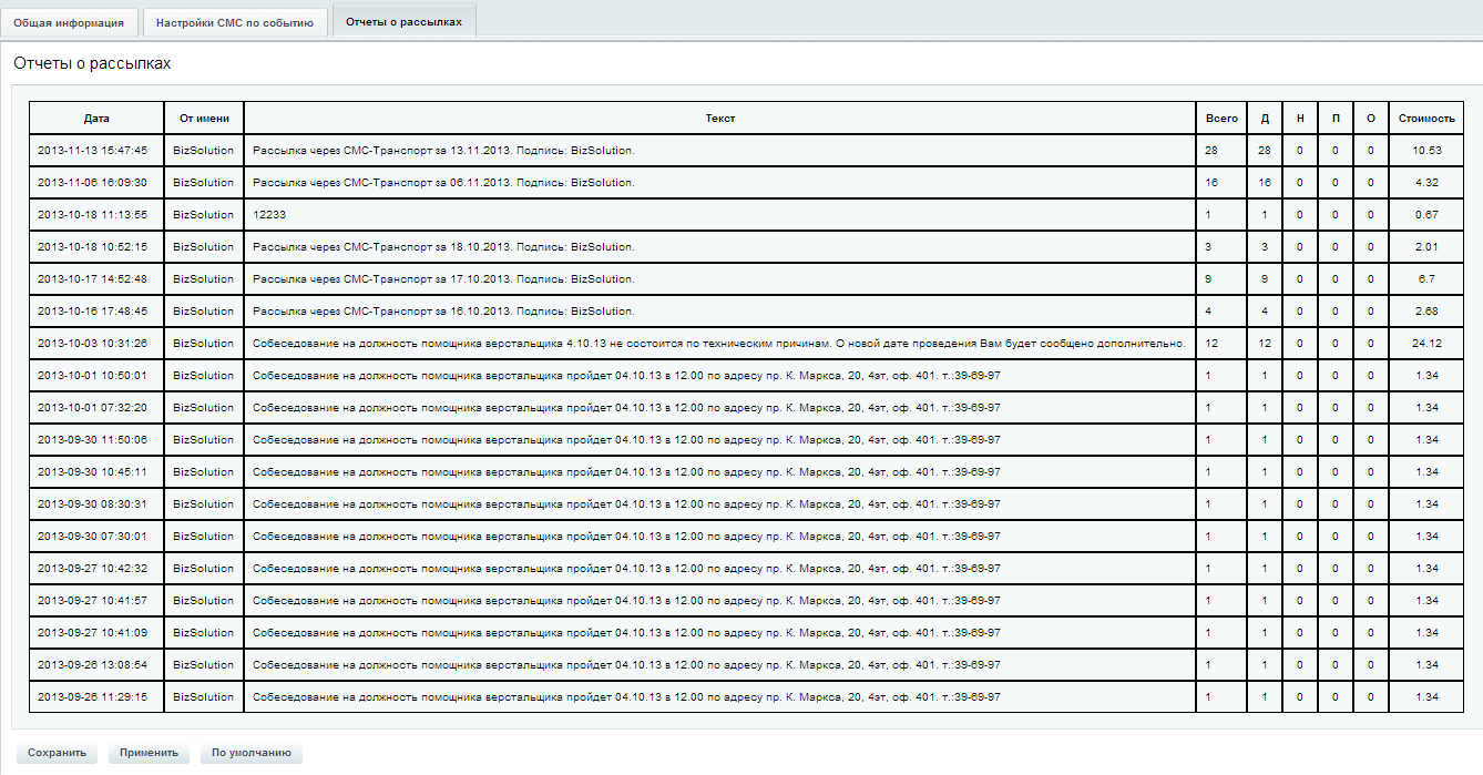 Рассылка SMS администратору сайта по дополнительным событиями, созданных на базе глобальных событий (регистрация нового пользователя, новое сообщение в блоге, и т.д.) с поддержкой многосайтовости. - Отчёты доставки. Просмотр отчета доставки SMS.