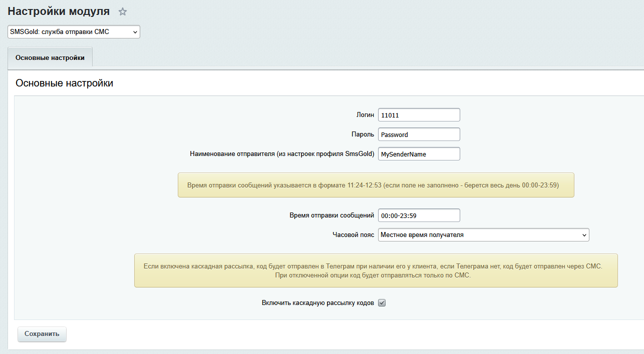 После установки модуля перейдите в его настройки. Укажите логин и пароль от вашего аккаунта SMSGold, а также введите наименование отправителя, как в настройках личного кабинета SMSGold.