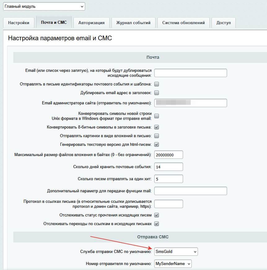 После сохранения настроек перейдите в настройки главного модуля и на вкладке "Почта и СМС" в разделе "Отправка СМС" выберите службу отправки СМС по умолчанию SMSGold, затем выберите номер отправителя.