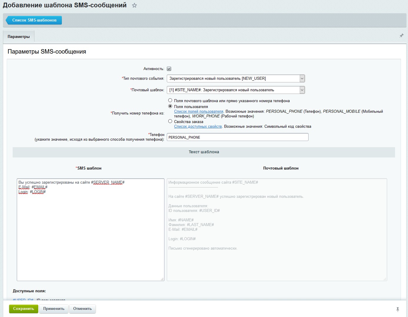 - Из полей пользователя: телефон, мобильный телефон, рабочий телефон. Причем, определение пользователя производится по макропеременной почтогового шаблона #USER_ID#