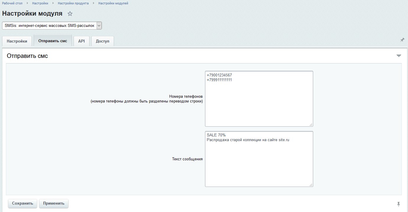 - Отправить определенный текст сообщения заданному списку номеров на вкладке "Отправить SMS" (Настройки -> Настройки продукта -> Настройки модулей -> SMSis: интернет-сервис массовых SMS-рассылок).