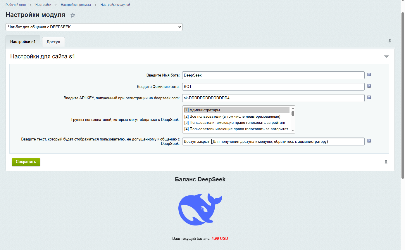 Также в админке сайта, в настройках модуля показывается баланс в аккаунте deepseek.com